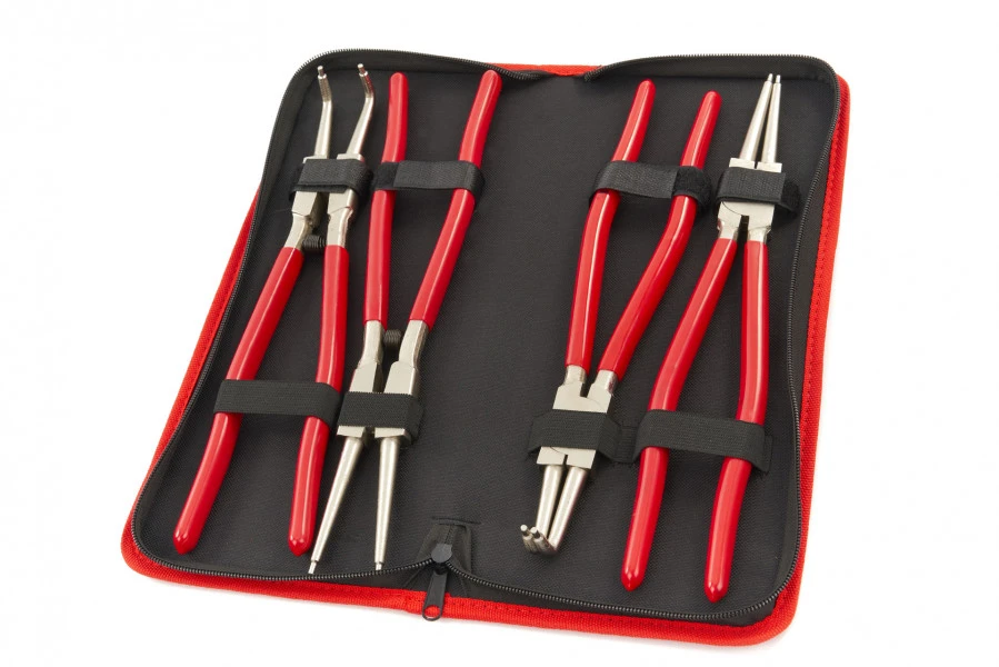 Elke soort tang heeft een andere kop, zodat je in verschillende hoeken werkt en zowel uitwendig als inwendig borgveren en ringen bevestigt. De opbergetui is gemakkelijk mee te nemen door zijn stevige afwerking met extra padding aan de buitenzijde en de gestikte boord. Je sluit de etui daarbij veilig af door midden van een rits. De set heeft een professionele, moderne uitstraling door de combinatie van zwart en rood op de etui, en het rood en glanzende metallic kleur van de handvatten en de tangbekken.