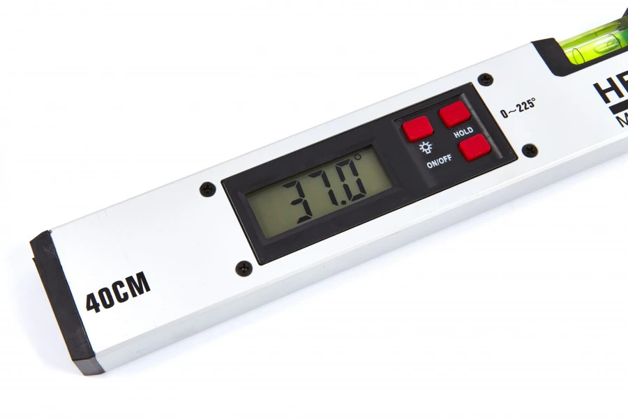 Deze digitale hoekwaterpas en zweihaak is de ultieme droom van iedere professional en hobbyist. Het model heeft een verlicht display dat je eenvoudig aan of uit kunt zetten en het model is voorzien van een hold functie. Daarnaast wordt de digitale hoekwaterpas en zweihaak geleverd inclusief 9 Volt batterij, zodat je direct aan de slag kunt gaan met deze erg veelzijdige tool. De totale afmeting, als de digitale hoekwaterpas en zweihaak in is geklapt, bedraagt 415 x 20 x 50 mm.