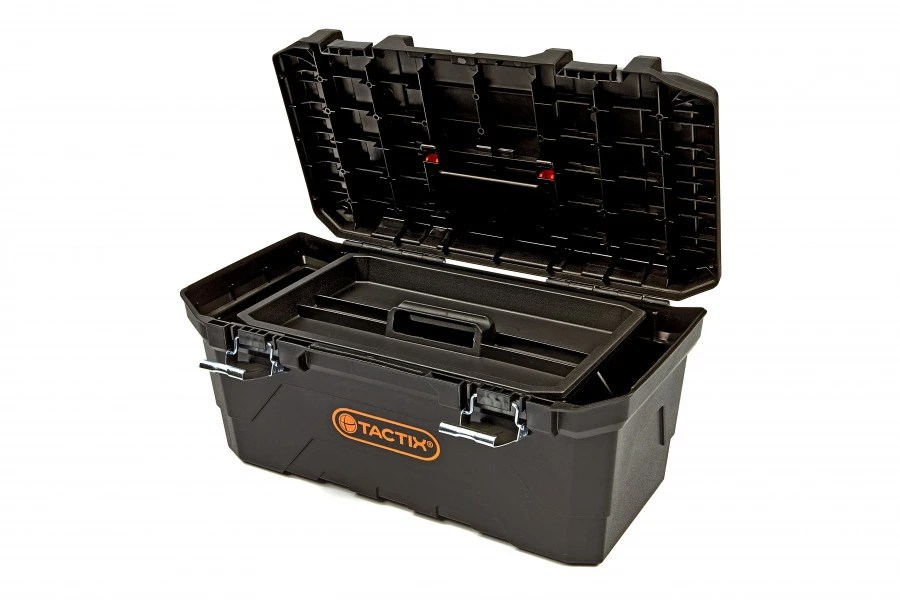 Robuuste gereedschapskist met insert. Gemaakt van PP-kunststof, met degelijke scharnieren en sluitingen.