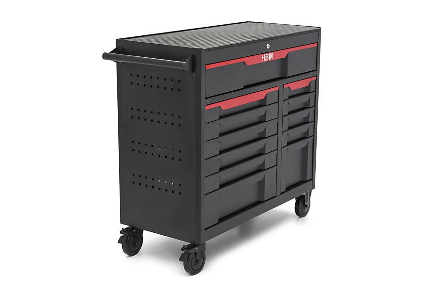 Ontdek onze HBM gereedschapswagen met 12 laden, 106cm breed, uitgevoerd in een elegante zwarte kleur. De constructie is vervaardigd uit industrieel staal. Dit waarborgt duurzaamheid en maakt de wagen bestand tegen zware belastingen. Bovendien is hij voorzien van een zwarte en rode hoogglans poedercoating, die niet alleen een fraaie uitstraling geeft, maar tevens bescherming biedt tegen slijtage.