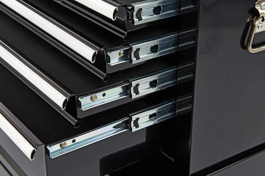 Met de meegeleverde sleutels kun je het deksel eenvoudig vergrendelen. Bovendien zijn er twee stalen stangen om de bovenste laden van de opzetkast te vergrendelen wanneer het deksel gesloten is, waardoor extra beveiliging wordt geboden voor je waardevolle gereedschap.